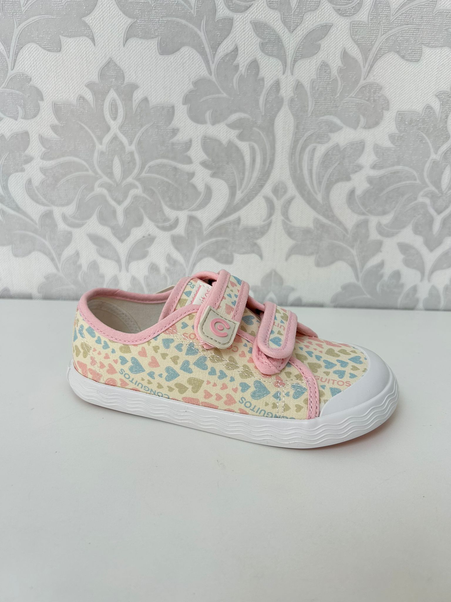 Zapatillas deportivas Goflex Barefoot de lona multicolor en un suave tono rosa con estampado de corazones en tonos pastel y una suela original con detalle de ondas y doble cierre adherente para el día a día.
