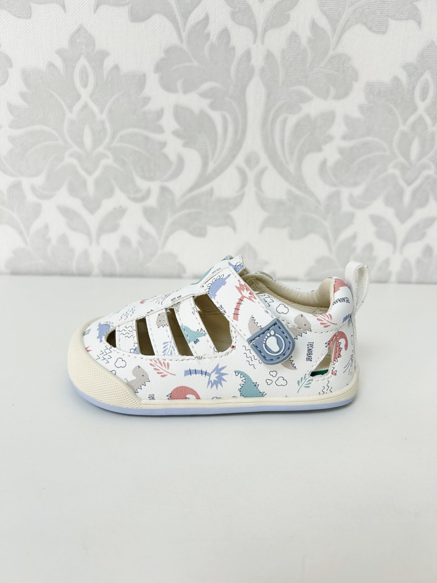 Estas sandalias cerradas barefoot azules con dinosaurios están pensadas para las aventuras diarias en los días de calor, combinando la protección de una puntera cerrada con aberturas transpirables. Sus dos cierres adherentes permiten un ajuste rápido y seguro, mientras que el refuerzo de goma en la puntera ayuda a proteger los dedos. Con suela zero drop, puntera ancha, horma recta y diseño flexible, favorecen el movimiento natural a cada paso. Están acabadas con un divertido estampado de dinosaurios.