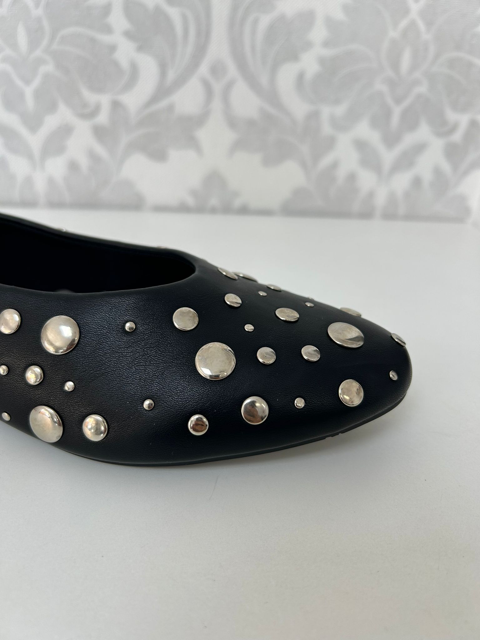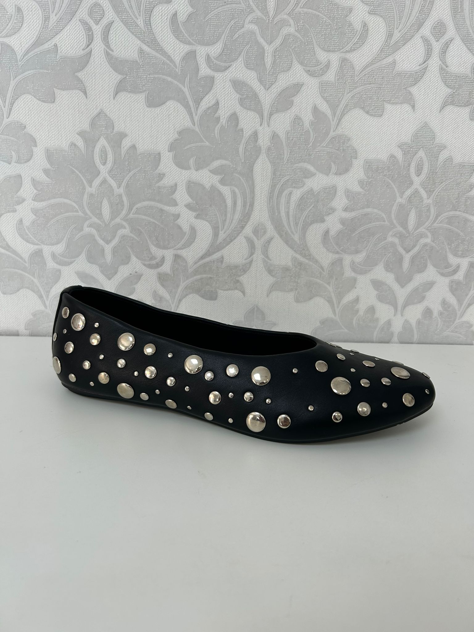 Esta bailarina, con su distintivo y versátil color negro, es la base ideal para crear looks que van desde lo casual a lo más atrevido. Su diseño diario se actualiza gracias a los detalles de tachas que adornan el borde, dándole ese aire vanguardista que la distingue.